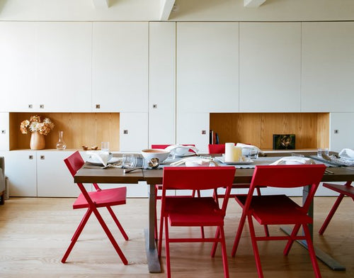 Designed by architect David Chipperfield for Alessi, the Piana is a beautiful folding chair which celebrates its function through form. With all of its hardware concealed, the three parts of a chair rotate around a single axis. This creates a beautiful profile, with elegant clean lines, and a chair that folds completely flat for stacking or hanging against a wall. Made in Italy and suitable for outdoor use.