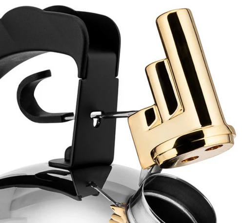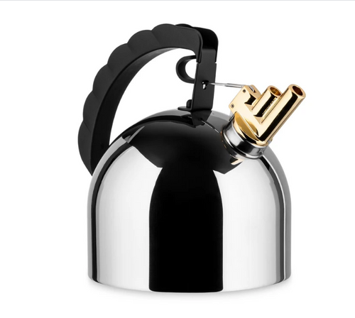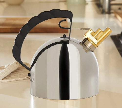 The 9091 kettle has a melodic whistle made of brass in a shape that has never been seen before and consisting of two small vents in which the tuners that reproduce the notes mi and si are inserted. Richard Sapper created this kettle inspired by a childhood remembrance, the poetic sound of boats' sirens at River Rhine: this is because the melody that accompanies the vapour outlet must be pleasant and not anxious like the whistle of boilers. This kettle is a polysensory object which will not interrupt an enjoyable break with a whistle, but with a captivating melody.