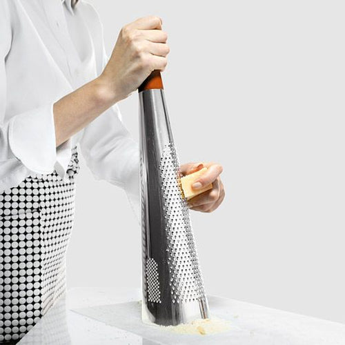So what you need to know is that Sapper, one of the designers who has been with Alessi the longest, the creator of some of their most innovative objects, in his own home is in charge of grating cheese for the whole family. Thus his inspiration was based on extensive personal experience on this theme and this time around he has come up with a novelty that will be the joy of consumers of grated cheese. “Todo” has a truncated cone shaft that is exceptionally long and will grate enough cheese to satisfy the requirements for one portion just with one complete stroke. An excellent example of an object to exhibit on the table or in the kitchen, but at the same time it boasts a precise, state-of-the-art functional performance that just about transforms into playful gestural expressiveness one of the most boring and least qualifying culinary operations.