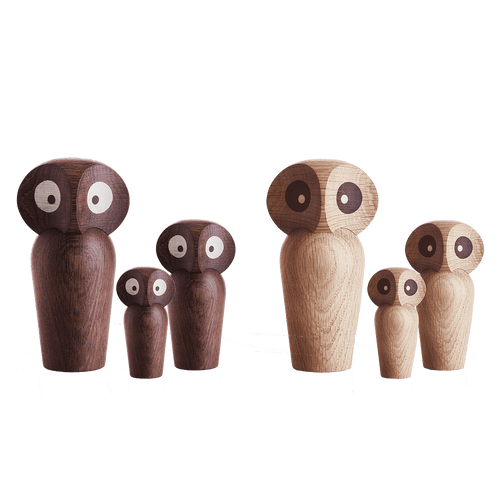 For years, Paul Anker Hansen made the Owl himself. Now, we continue to make it by hand and with the same precision. The body is made in oak wood, and its eyes are inserted with maple and wenge wood. The head has a magnet attached, so it can move seamlessly in multiple directions to create various expressions. It comes in three sizes: Mini, Small, and Large.