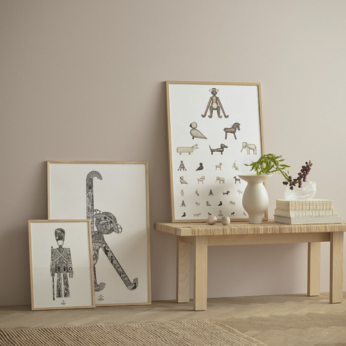 Charming brown and white poster featuring images of Kay Bojesen’s incredibly popular wooden figurines. This decorative poster was hand sketched by Vicky Gry Hjortsøe.