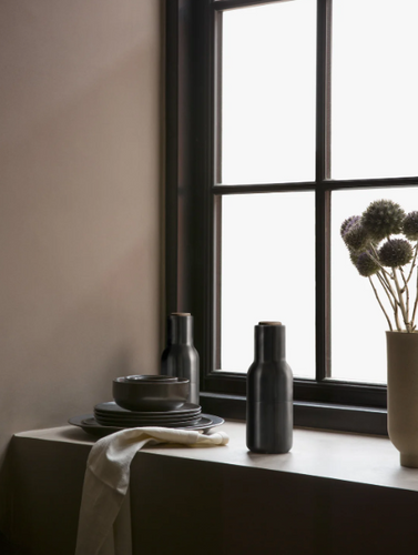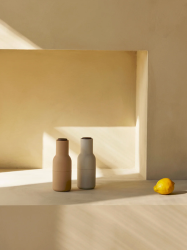 The form, shaped more like a bottle, cleverly tricks the user to encourage a more playful and experimental interaction with the product. The powerful ceramic mechanism makes the grinder easy to operate and perfect for a wide range of dried spices, seeds, salt and pepper. You simply open them, fill them with delicious ingredients and close them again. With the grinding mechanism located at the top of the set, it also ensures that you will keep your counter or kitchen table clean from salt and pepper flakes common with most other grinders. The Bottle Grinder collection is available in a range of beautiful, soft Scandinavian colours and is now extended with addition of brushed brass and bronzed brass versions