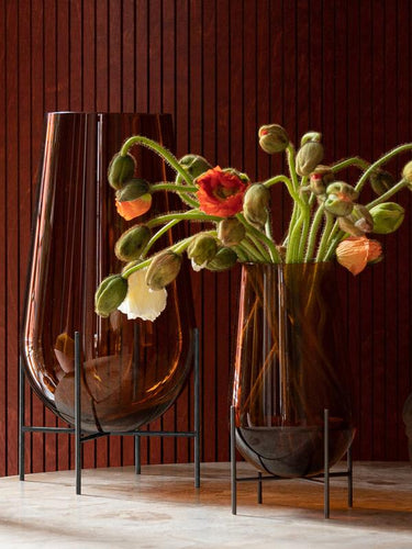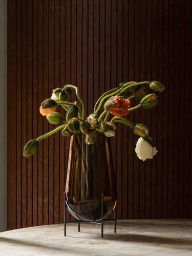 The Échasse Vase—The first piece in the now-iconic Collection was inspired by laboratory test tubes. The drop-shaped form is as elegant when holding flowers on a desk, living room floor, or nightstand as it is when left unfilled. The smoked glass version with brushed brass legs is available in three sizes. The unique colour gradients of the glass give the design depth and contrast against the legs’ clean lines. The smallest vase is now available with clear glass and bronzed brass legs; a classic pairing to complement any interior palette, in a size ideal for more compact spaces.