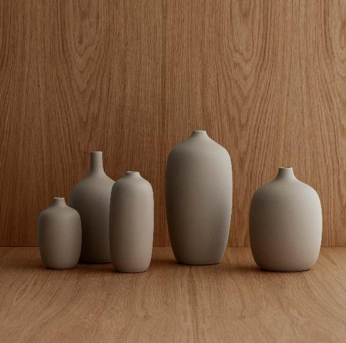 With the CEOLA Vase by German designer Frederike Martens, the greens in your life have found a new home. The collection comprises five different shapes and sizes in either a soft white, a soft and sandy shade of khaki or taupe, but all with the same narrow mouth presenting the plant in a beautiful upright position while making sure the stem will not bend or break. The rounded, organic silhouette of the vase is inspired by traditional Japanese metal vases.