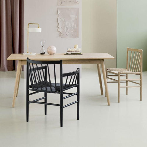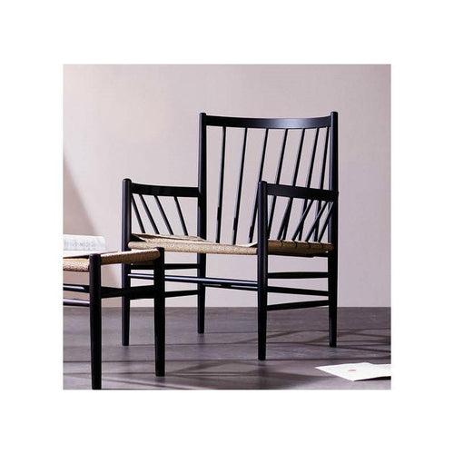 FDB Møbler’s J82 armchair is an attractive wooden chair designed by Jørgen Bækmark in the 1950s. Featuring an angular frame with rounded armrests and back, J82 chair is one of the icons of the mid-20th century Danish design. Paper yarn seat complements the natural look of the armchair. The black frame gives this classic look a modern twist.