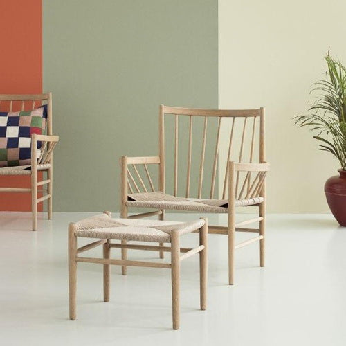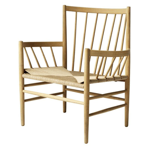 FDB Møbler’s J82 armchair is an attractive wooden chair designed by Jørgen Bækmark in the 1950s. Featuring an angular frame with rounded armrests and back, J82 chair is one of the icons of the mid-20th century Danish design. Paper yarn seat complements the natural look of the armchair. The black frame gives this classic look a modern twist.