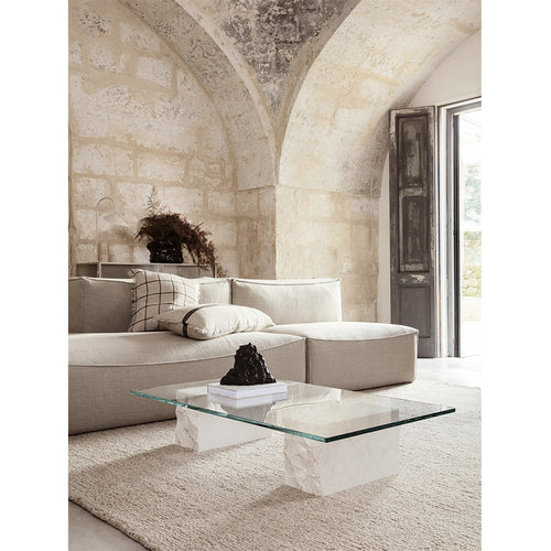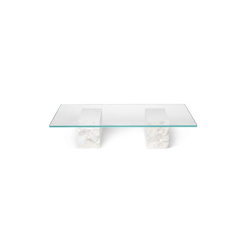 A harmonious marriage of natural materials and contrasting finishes, our Mineral Coffee Table showcases the intrinsic beauty of stone and glass. The smooth, rectangular glass top is placed on a base of two stone blocks – each with one end of which is left unfinished for a raw, textural look.
