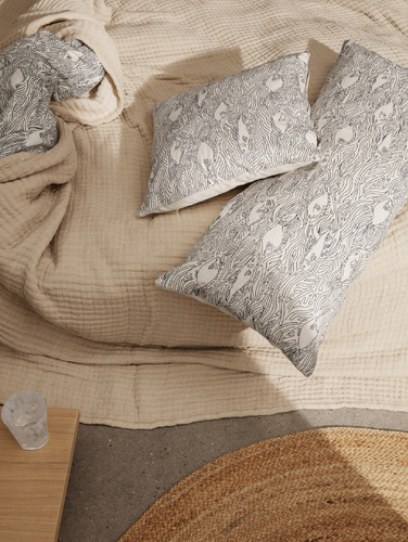 The Stream Cushions feature an abstract, playful print inspired by a Japanese aesthetic that captures the motion of swimming fish and the soothing, endless flow of water. Embroidered in a contrasting colour onto a pillowcase of raw, 100% GOTS-certified organic cotton, the cushion makes a cuddly and stylish addition that can be used both in the kid’s room and in your shared spaces.