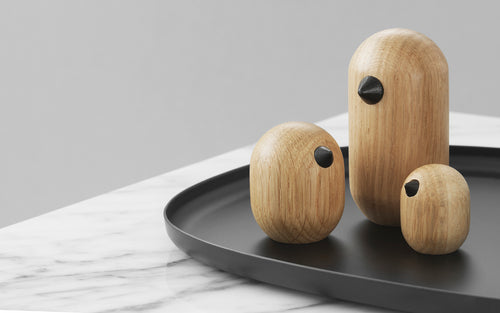 As a clear collector's item, Little Bird is sold individually so the flock of birds can continuously grow. The birds are available in two variations: in colored lacquer, where each figure has been given its own color, and in pure oak for a more classic look.