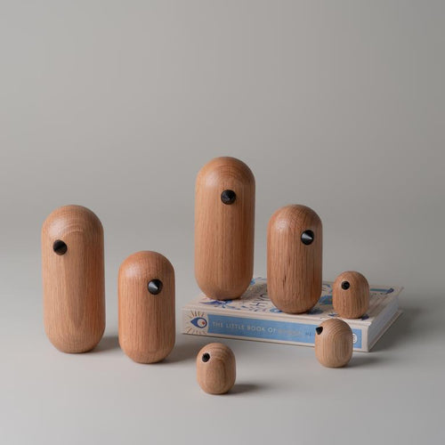 The birds are turned in wood with the fine and characteristic beak as the sole detail. The six different sizes in the range each represent a particular character in the designer's own family, where tiny design related variations give the birds personality.