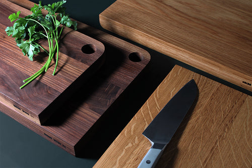 Handcrafted in Canada from two beautiful North American hardwoods, black walnut and white oak, the single curved edge-grain construction provides these wooden cutting boards with refined character as well as toughness. The utility hole makes it easy to handle or hang when not in use.