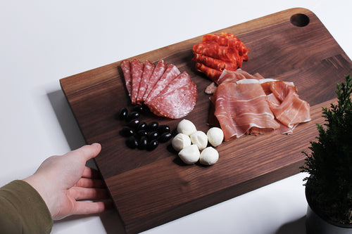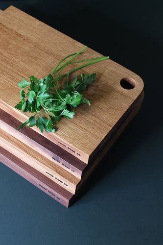 The small wooden cutting boards are ideal for kitchen prep, sturdy for chopping and delivering ingredients into the pan. The larger cutting boards become gorgeous grazing boards for cheese, charcuterie, and desserts. The wood is finished with a food-grade mineral oil.