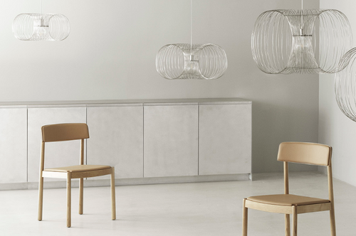 The new Coil lamp collection is designed with the desire to create as much volume as possible with as little material as possible. Coil is characterized by its rounded rectangle shape created by curved stainless steel wires. The air between the threads makes the design appear light and airy despite its enormous volume, making air as important to the design as the material itself.