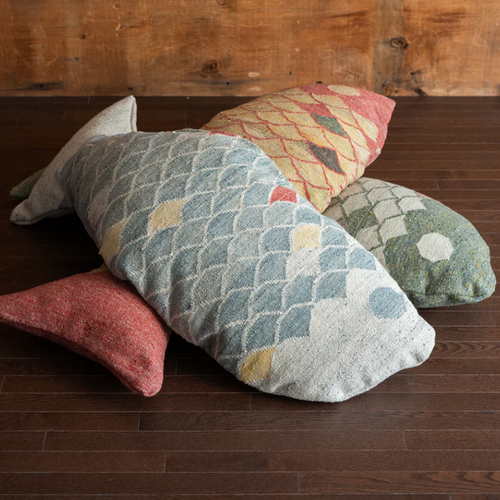 The FISH pillow is a flatweave kilim made on a hand loom. The inside of the pillow is made of cotton canvas with a hidden zipper, filled with shredded Memory Foam.