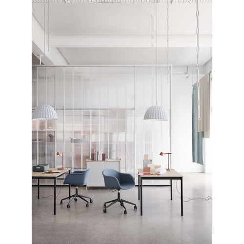 The lamp embraces and shelters the table and people beneath it – both physically and in a more abstract sense. The material absorbs sounds and helps to improve the acoustics of the room, making Under the Bell a perfect luminaire above the dining table and in other spaces where people gather to talk together.