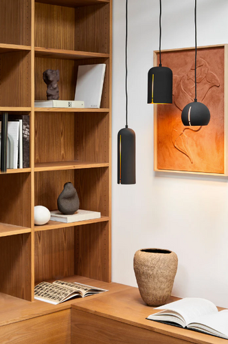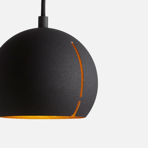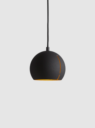 The Gap pendant combines a raw outer shell made from powder-coated metal with a feminine brass coloured inner creating a warm and cosy glow. The sleek gap in the shape lets light escape and create a graphical reflection with a golden glow from the inside. Hang the Gap pendant on its own in combination with more Gap pendants to increase to experience of the reflection.
