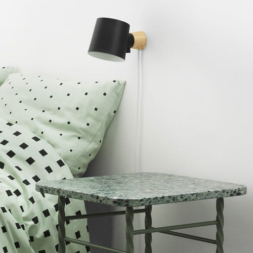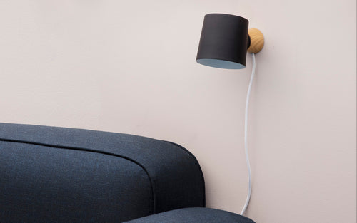 The wooden base in ash forms a beautiful contrast to the raw, industrial shade. A turning joint makes it possible to rotate the shade and thus change between direct and indirect lighting, making it perfect as both a reading lamp and as mood lighting. With its minimalistic design and choice of materials, the Rise wall lamp integrates easily into any interior design.