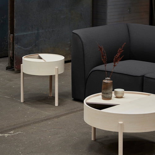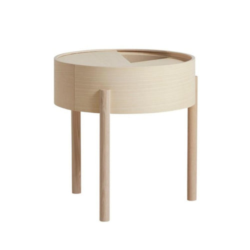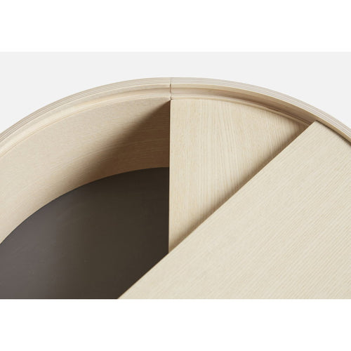 By simply rotating half of the circular lid, the expression of the table is ever changeable. The surface on the inside storage space is covered with a smooth nanolaminate to complement the ash wood while the three-legged construction adds a playful and light touch to the geometric shaped design.