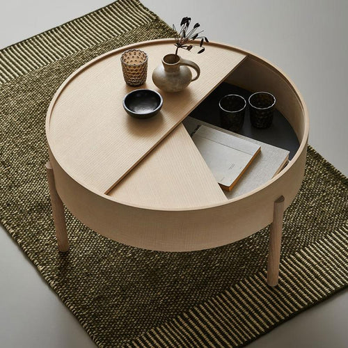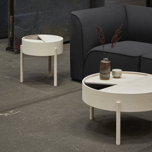 By simply rotating half of the circular lid, the expression of the table is ever changeable. The surface on the inside storage space is covered with a smooth nanolaminate to complement the ash wood while the three-legged construction adds a playful and light touch to the geometric shaped design.