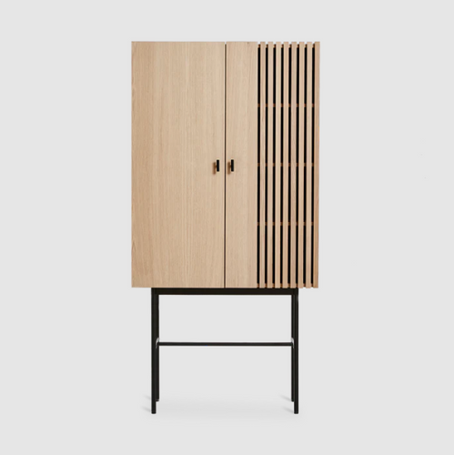 The Array series is inspired by the wooden slate cladding found in modern architecture. With its geometric shape and horizontal slats, it creates a strong visual effect from catching both light and shadow in the depth of the slats. The sleek legs lift the sideboards from the ground creating an elegant contrast between the solid wooden cabinet on top and the thin metal construction underneath. Soft closing doors make the cabinet both functional and delicate.