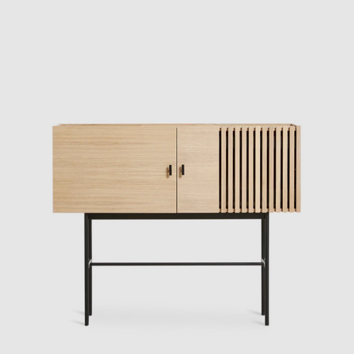 The Array series is inspired by the wooden slate cladding found in modern architecture. With its geometric shape and horizontal slats, it creates a strong visual effect from catching both light and shadow in the depth of the slats. The sleek legs lift the sideboards from the ground creating an elegant contrast between the solid wooden cabinet on top and the thin metal construction underneath. Soft closing doors make the cabinet both functional and delicate.