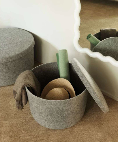 Hide Storage Pouf is a versatile, multifunctional piece of furniture that is a bit more resourceful. At the heart of the Hide Storage Pouf is its material composition. Crafted from PET felt, this remarkable fabric is made from post-consumer plastic bottles that undergo a transformative process where they are extruded into fine polyester fibers, which are then carefully pressed to create a durable and aesthetically pleasing felt material.