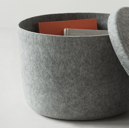 Hide Storage Pouf is a storage and pouf in one. Hide is made from PET felt, which consists of post-consumer plastic bottles which are extruded into polyester fibers and then pressed into felt. The seat of the pouf can be removed, revealing the hollow space inside which makes the design convenient for storage purposes.