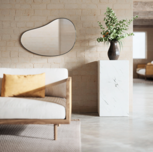 This unique, organic-shaped mirror is a new addition to our Hubba Family. With a special keyhole to help orient this mirror in 8 different ways, hang Pebble in a way that best fits your space. This playful mirror makes a perfect addition to a variety of spaces in the home - from entryway to bathrooms, playrooms and more. It measures 24 x 36 inches and has a thin, decorative metallic frame.