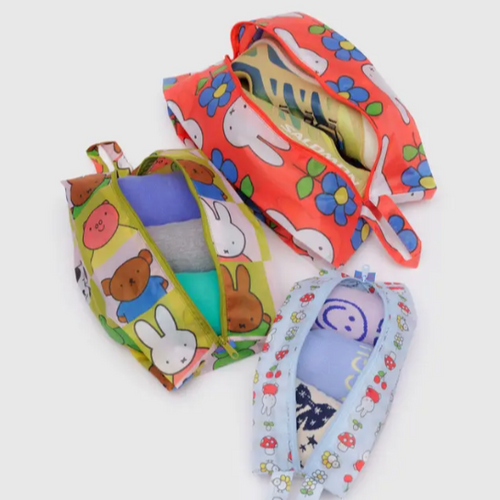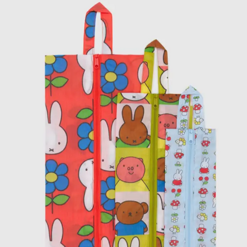 A set of three Miffy zippered pouches for travel and organization, with loops for carrying and hanging on the go. Perfect for packing, organizing your bag, or home tidying.