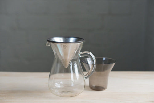 According to the Japanese Brand Kinto, "The series 'Slow Coffee Style' was born to bring you the taste of coffee brewed by the pour-over method with the relaxed passage of time." This carafe set includes a stainless steel filter, a beautiful glass carafe, and a plastic resin receptacle to hold the filter once brewing is complete so that there is no mess.  All pieces are dishwasher safe. The glass carafe is  microwave safe.