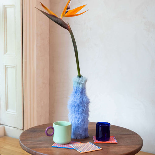 Make your own set with these modern faux fur bottle sleeves. Perfect for gifting or decor. Stretches to fit a variety of bottle sizes, including standard 750 ml wine bottles. Made new and repurposed deadstock yarn. Sold separately.