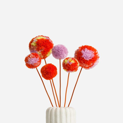 Set of 6 modern, fluffy pom flowers on flexible yet sturdy 12” long metal wire. Each bouquet includes 1.5” small and 2.5” medium pom flowers. Arrange in a vase or add anywhere a pop of color is needed. Made from repurposed deadstock yarn.