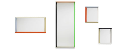 Vitra's Colour Frame mirror captivates with its unrestrained use of colour: each side of its rectangular wooden frame is painted in a different hue. The four sides are each designed in different hues, with two brightly coloured versions and one understated model available per size. The depth of the frame makes it a useful storage shelf for small utensils, such as keys or eyewear, or a display surface for small decorative objects.