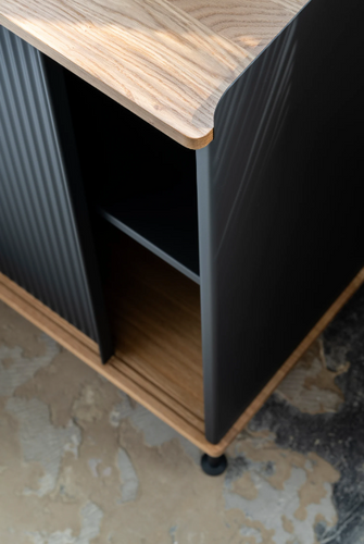 The Enfold Sideboard combines industrial materiality with residential references for a new perspective on modern storage. Made from a lacquered steel that gently enfolds its top and bottom in solid oak, the Enfold Sideboard fuses cold and warm materials for a unique expression, paired with the vibrantly modern expression of its ridged steel doors. The flexible design is available in four sizes, which all have adjustable shelves and discreet cable outlets. This offers the opportunity to find just the right fit for your space, function and needs — be it a media console, in the hallway or a tall sideboard for storage.