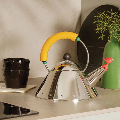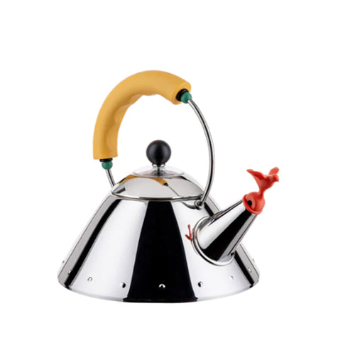 It's no surprise that the Alessi Kettle with Bird Whistle has sold more units than any other item in Alessi history. Designed by Michael Graves in 1985, the Alessi bird kettle has a youthful personality and a simple geometry, allowing it to heat faster than other kettles thanks to its tapered stainless steel body and spout. The bird spout cheerfully whistles when the water has reached a boil.
