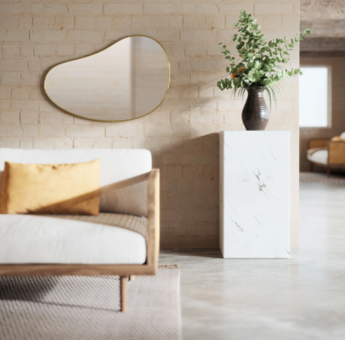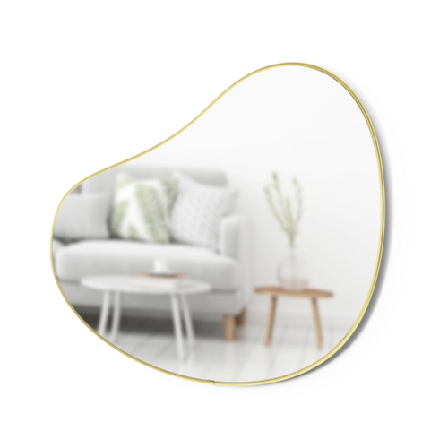 This unique, organic-shaped mirror is a new addition to our Hubba Family. With a special keyhole to help orient this mirror in 8 different ways, hang Pebble in a way that best fits your space. This playful mirror makes a perfect addition to a variety of spaces in the home - from entryway to bathrooms, playrooms and more. It measures 24 x 36 inches and has a thin, decorative metallic frame.