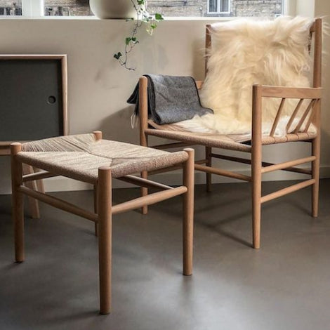 FDB Møbler’s J83B Ottoman is an attractive wooden piece designed by Jørgen Bækmark in the 1950s. Featuring an angular oak frame with paper yarn seat, the organic look of J83B ottoman is versatile – it can be used, for example, as an extra seat in the living room or kitchen, and is perfect as a place to rest your feet after a long day.