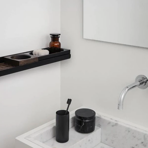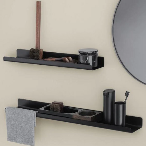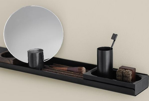 blomus MODO Wall Shelf is a small and intelligent multi-functional shelf that allows for customization according to individual needs and preferences. The beautiful shelf made of titanium-coated stainless steel is timeless and elegant with its black powder finish. The shelf coordinates with other bath accessories from the MODO line and is made to contain MODO organizers to neatly display toiletries, makeup, hair accessories and even the MODO soap dispenser or tumbler. (Accessories for the Wall Shelf include the Square or Rectangular Wood Tray or the Acrylic Tray).