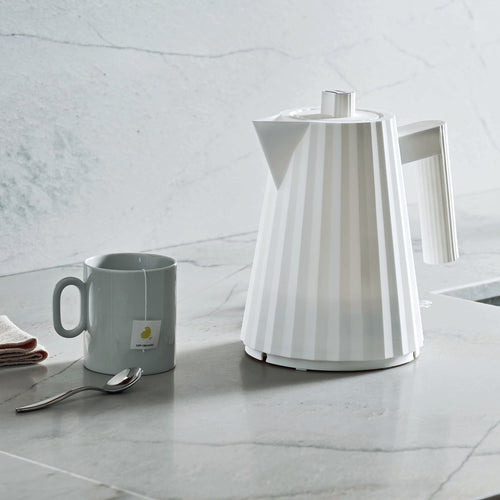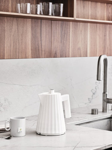 Michele De Lucchi's design for Alessi's Plissé Electric Kettle elevates an everyday object into a useful sculptural accent for the modern kitchen. Made of black thermoplastic resin, the crisp pleats create a lovely play of light and shadows. With 1500 watts for quick boiling, a removable filter for easy cleaning, an automatic shut-off, and a cord-free base, the Plissé is as functional as it is fabulous.