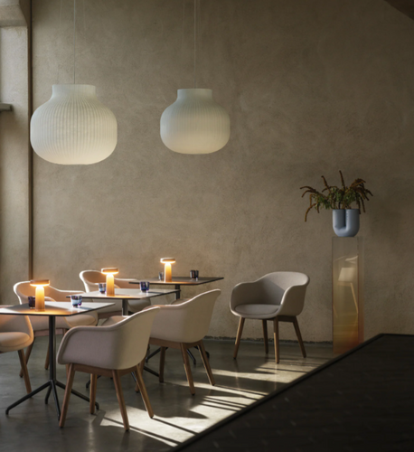 The Strand Pendant Lamp is designed with soft, playful forms for a modern expression. The design provides both diffused lighting and direct lighting, the latter through its top and bottom opening. The design is made in a sprayed cocoon material that consists of tiny strands for a complex, intriguing structure that, paired with its modern form, gives the Strand Pendant Lamp an almost cloud-like appearance. With its cocoon material filtering light through for a warm, comfortable glow, the Strand Pendant Lamp hovers lightly in space, bringing comfort, harmony and a refined sensitivity to any room.