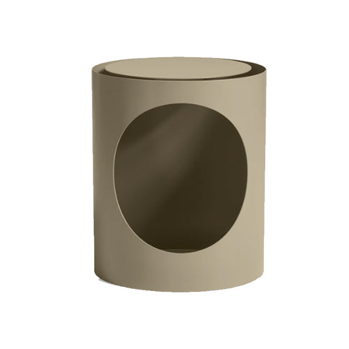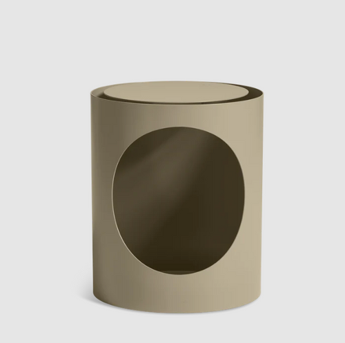 TABL is a graphic metal side table designed from the idea of optimising material by providing the design with a new function without adding additional material. A circular part of the classic cylindrical base has been cut out and transformed into a functional tabletop. Consequently leaving a round, open space in the foundation for storage of books, throws or creative pursuits.