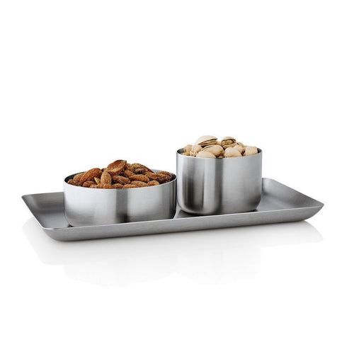 This line of stainless steel trays, are designed with clean lines using timeless brushed stainless steel. Mix and match blomus BASIC trays, condiment holders and snack cups for a timeless presentation at breakfast, tea time or cocktail hour.
