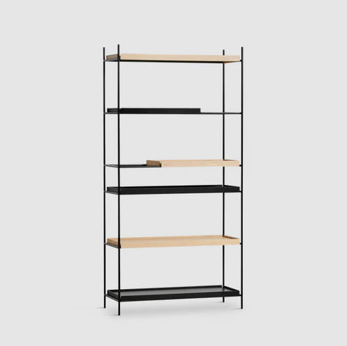 Material: Frame: Black painted metal, Trays: Black painted oak and white pigmented oak, Endcaps: Black plastic